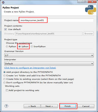 根據需求,填寫項目名稱,並選擇項目的類型為Jython,點擊Finish。