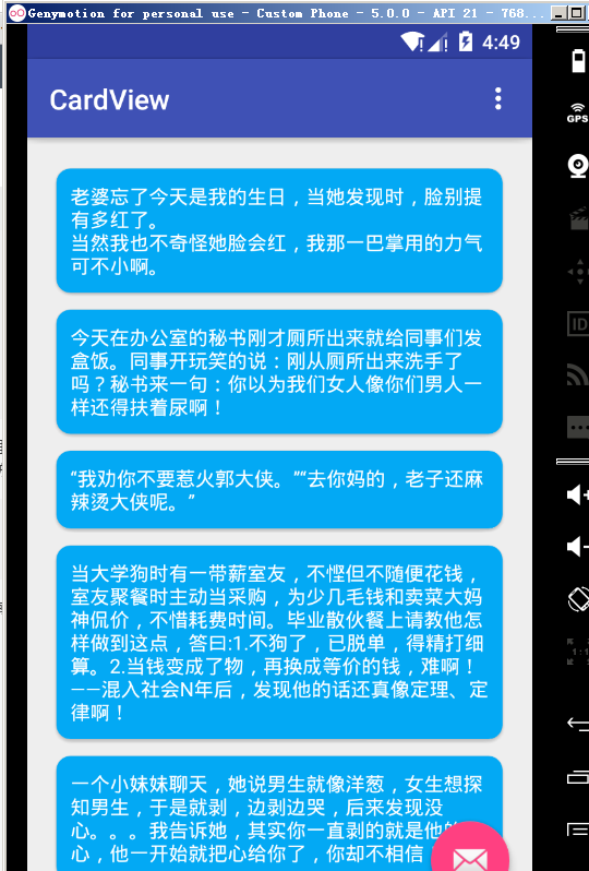 Android5.0中向我們介紹了一個全新的控件–CardView,從本質上看,可以將CardView看做是FrameLayout在自身之上添加了圓角和陰影效果。請注意:CardView被包裝為一種布局,並且經常在ListView和RecyclerView的Item布局中,作為一種容器使用。