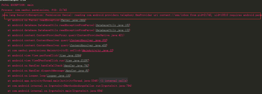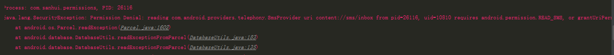 日志中很清晰的告訴我們,這個異常是因為沒有權限而造成的,那麼我們就直接給它加上讀取短信的權限來看看吧。