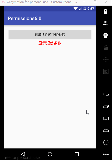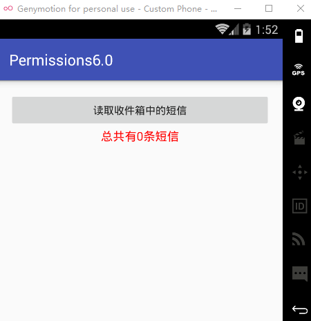 我們可以看到,當我們第一次點擊讀取短信時,它會先檢查該應用是否有權限,如果沒有,就去申請,這裡在界面上對應的就是顯示一個授權的對話框,第一次我們選擇了拒絕授權,然後在回調裡面就會對應先打印了我們的一個toast消失提醒我們拒絕了授權,但是當我們再次需要讀取短信時,它還會去申請授權,這時我們允許授權,然後我們就看到了,在顯示短信條數的TextView顯示了短信的條數。(這裡0條是因為的用的模擬器沒有短信,這不是重點。)