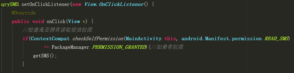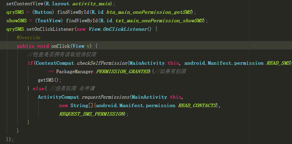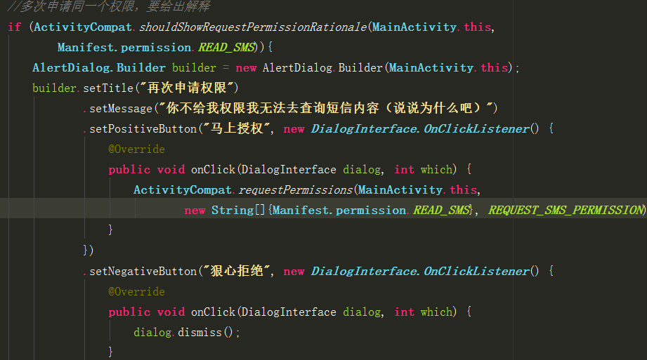 然後在方法內判斷用戶是授權了該權限組還是拒絕授權,如果授權則就去獲取短信信息,否則,在這裡我只是顯示了一個toast提示框。