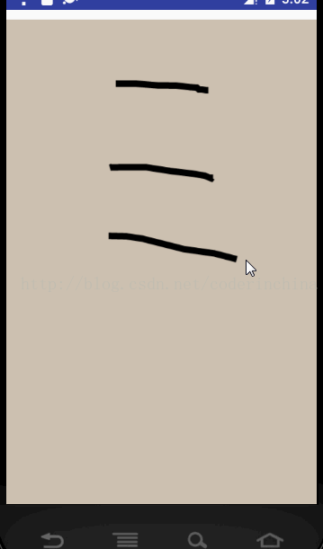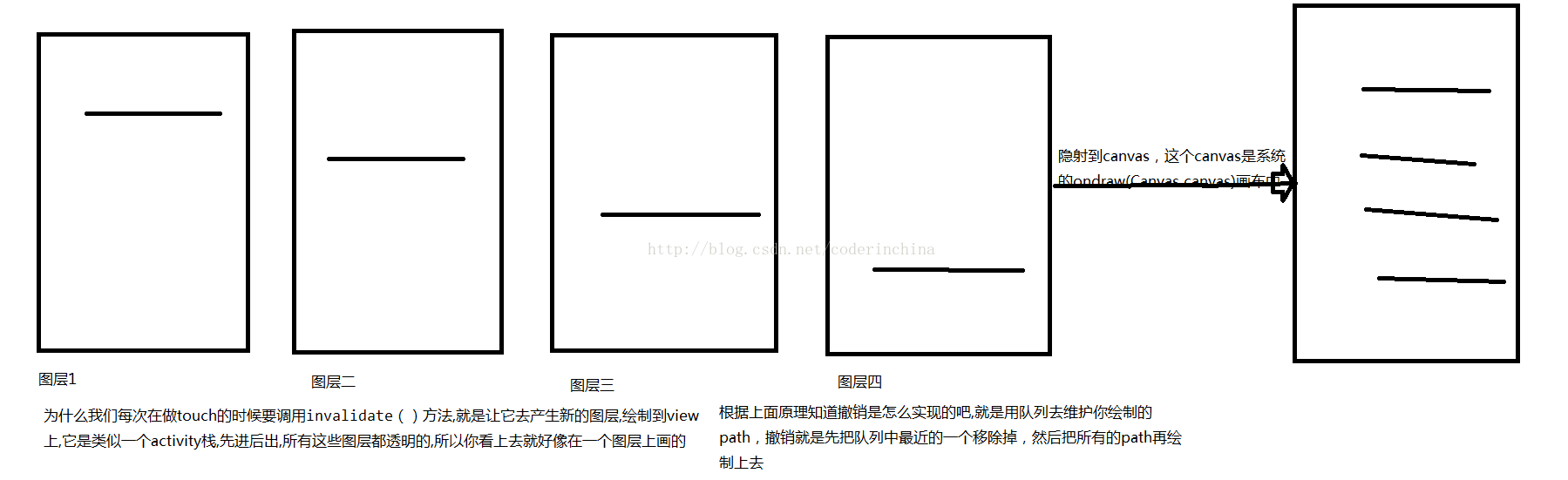 如果你不使用path的quadTo()用lineTo()方法也行,但是沒有使用queadTo()繪制出來的路徑光滑,這5條路徑是怎麼繪制到屏幕上去的呢?上面說了圖層的概念,如果不懂,可以去看下我之前寫的關於canvas博客,也可以去網上看其他的博客,