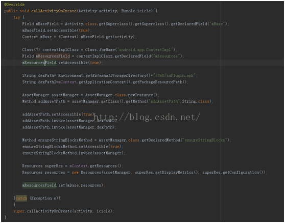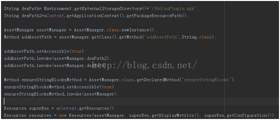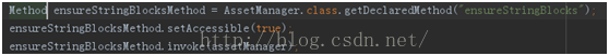 這樣就成功構造出一個指向插件資源的AssetManager。當然這時候還不能使用,還要調用AssetManager的ensureStringBlocks()方法來初始化其內部參數,同樣得使用反射。