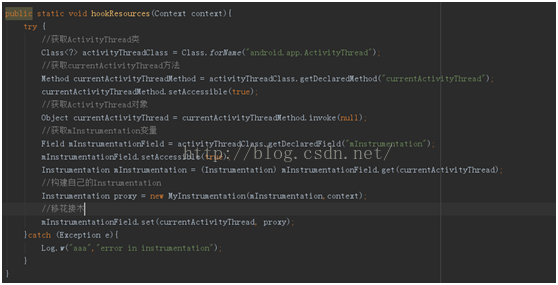 替換掉Activity裡Context裡的Resources最好要早,基於上面的觀察,我們可以在調用Instrumentation的callActivityOnCreate()方法時把Resources替換掉。那麼問題又來了,我們如何控制callActivityOnCreate()方法的執行,這裡又得使用hook的思想了,即把ActivityThread裡面的Instrumentation對象(mInstrumentation)給替換掉,同樣得使用反射。步驟如下