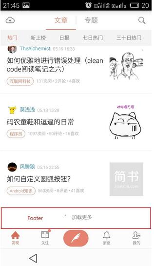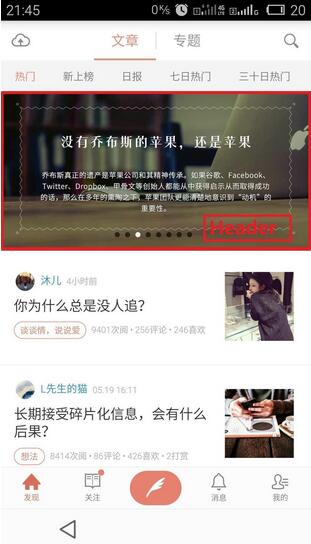 通過上面的兩張圖,可以看到,Header和Footer很多情況下是輔助功能的,比如Header通常用於做廣告,而Footer更多的是為了顯示下拉加載更多作為一個可視化組件來顯示加載情況,提升用戶體驗。
