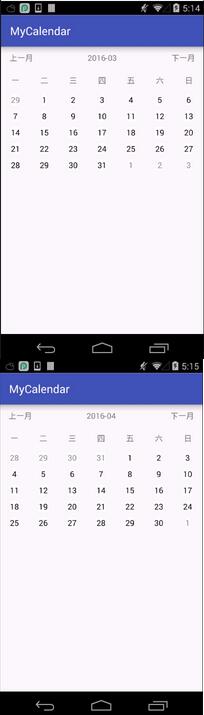 設置每一天時設置了一個字段為是否為本月,如果是,則設置為黑色,否則設為灰色顯示,在Adapter中的getView方法中設置即可。