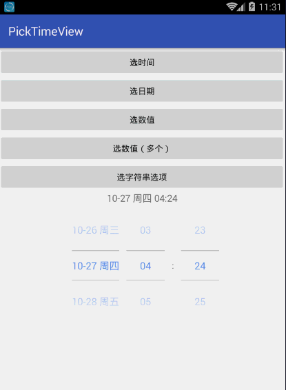 Android自帶的選擇時間控件有點丑,往往產品和設計都比較嫌棄,希望做成ios一樣的滾輪選擇,下面是我在NumberPicker的基礎上自定義的選擇控件,效果如下: