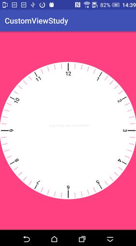 這個方法代碼看起來也沒有什麼主要是把一個圓分成60份,因為我們鐘表上是有60個刻度,其中設置了4個大刻度分別為0,15,30,45.分別對應的鐘表中12點 3點 6點和9點,如果這個地方你有什麼疑惑的吧你可以看看你的手表或者鐘表就明白了,同時裡面也設置了8個中等刻度分別為5,10,20,25,35,40,50,55為中刻度,其實對應的就是1,2,4,5,7,8,10,11點。這裡主要是自己覺得這樣分明好看而已,如果沒有強迫症的你可以直接設置都是大刻度就可以了。其他的都為小刻度,根據自己在attr設置的顏色和尺寸分別設置畫筆paint來繪制就可以了。看下我們的效果變成了這樣子: