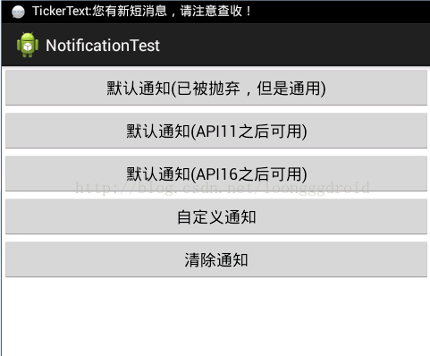 我們也知道Android系統也是在不斷升級的,有關Notification的用法也就有很多種,有的方法已經被android拋棄了,現在我實現了三種不同的方法,並適應不同的android版本。現在我就把代碼公布出來,我喜歡把解釋寫在代碼中,在這裡我就不多說了,