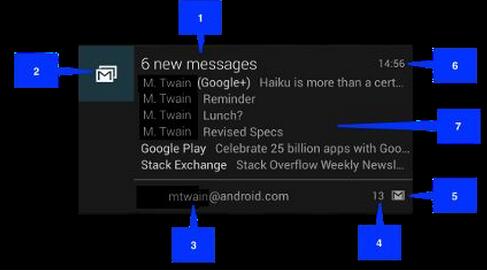只有當notification被展開的時候這種寬視圖的notification才會出現,通過手勢操作可以展開一個普通的notification(部分定制系統不可以,會直接顯示寬視圖)。這種風格的notification從android4.1以後才開始支持。下面的截圖展示了inbox風格的notification: