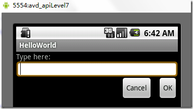 從上面的布局文件我們知道,RelativeLayout視圖組包含一個TextView、一個EditView、兩個Button,注意標記了<!-- have an eye on ! -->(請注意運行代碼的時候,請把這些注釋去掉,否則會運行出錯,上面加上是為了更加醒目!)的屬性,在使用相對布局方式中就是使用這些類似的屬性來定位視圖到你想要的位置,它們的值是你參照的視圖的id。這些屬性的意思很簡單,就是英文單詞的直譯,就不多做介紹了。運行之後,得如下結果: