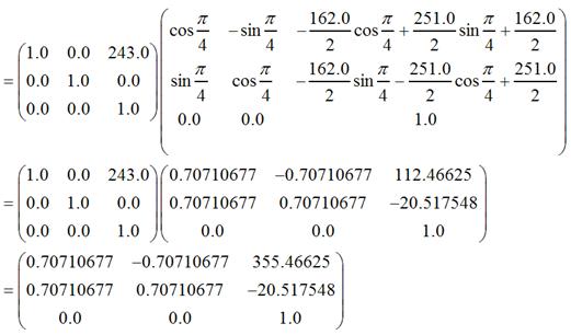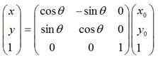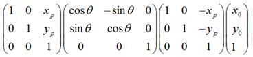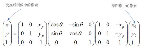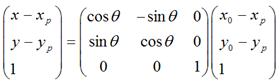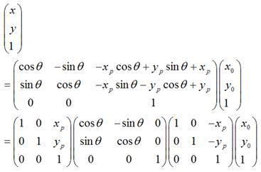 所以,圍繞某一點進行旋轉變換,可以分成3個步驟,即首先將坐標原點移至該點,然後圍繞新的坐標原點進行旋轉變換,再然後將坐標原點移回到原先的坐標原點。