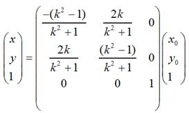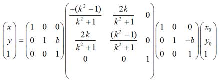 如果對稱軸是y = kx + b這樣的情況,只需要在上面的基礎上增加兩次平移變換即可,即先將坐標原點移動到(0, b),然後做上面的關於y = kx的對稱變換,再然後將坐標原點移回到原來的坐標原點即可。用矩陣表示大致是這樣的:
