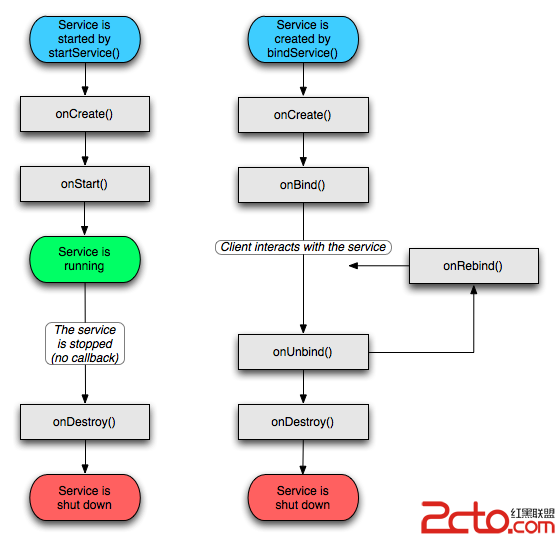 上面展示的是沒有綁定服務和有綁定服務的生命周期的不同情況的過程。