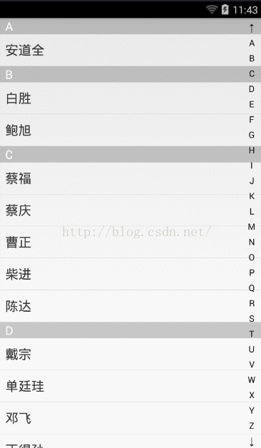 listview的每個item是一個線性布局包裹的兩個textview,上面的tv顯示的是拼音的第一個字母,下面的tv顯示的就是名字;在adapter判斷當前條目和上一個條目的拼音首字母是否相同,如果相同隱藏當前item上面的tv;