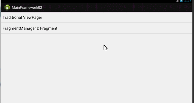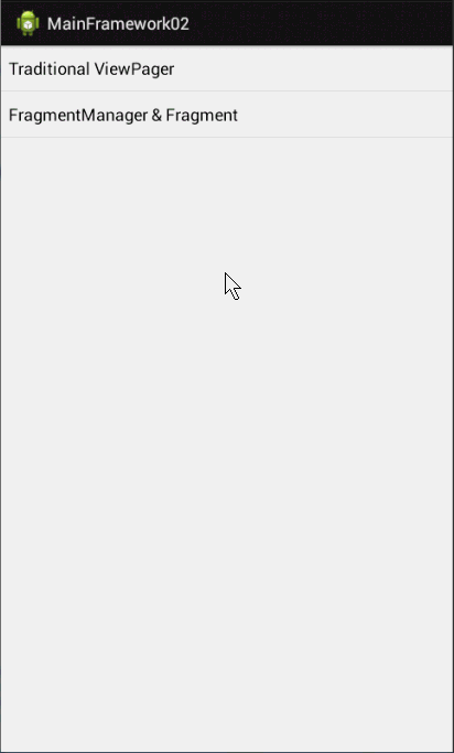 評價:實現效果和第一種效果一模一樣,每個Fragment獨自處理自己內部的邏輯,代碼整潔很多,並且支持左右滑動。感覺是第一種和第二種的結合版本。
