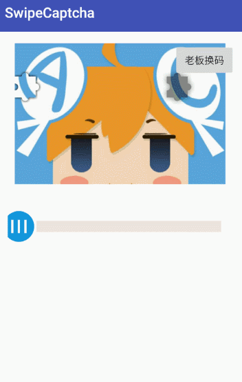 <?xml version="1.0" encoding="utf-8"?> <RelativeLayout ...... > <com.mcxtzhang.captchalib.SwipeCaptchaView android:id="@+id/swipeCaptchaView" android:layout_width="300dp" android:layout_height="150dp" android:layout_centerHorizontal="true" android:scaleType="centerCrop" android:src="@drawable/pic11" app:captchaHeight="30dp" app:captchaWidth="30dp"/> <SeekBar android:id="@+id/dragBar" android:layout_width="320dp" android:layout_height="60dp" android:layout_below="@id/swipeCaptchaView" android:layout_centerHorizontal="true" android:layout_marginTop="30dp" android:progressDrawable="@drawable/dragbg" android:thumb="@drawable/thumb_bg"/> <Button android:id="@+id/btnChange" android:layout_width="wrap_content" android:layout_height="wrap_content" android:layout_alignParentRight="true" android:text="老板換碼"/> </RelativeLayout>