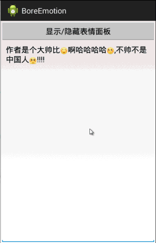 實質上還是對表情對應的文本數據進行操作,這裡最要注意的地方是輸入框中的光標問題,輸入框其實也是TextView的一種,顯示和之前介紹的方法一樣,但是動態的添加和刪除就需要注意處理位置的問題了。