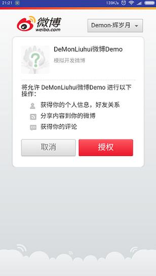 大致思路如下:建立一個webview加載授權界面,授權回調地址請參考Constants.java裡面有詳細注解。頁面加載時會回調該方法,如果用戶同意(輸入自己微博的賬號密碼)就會成功獲取code然後發送一個異步的post請求獲access_token 若成功獲取access_token信息,則使用SharedPreferences保存所有重要信息,並跳轉到主界面。