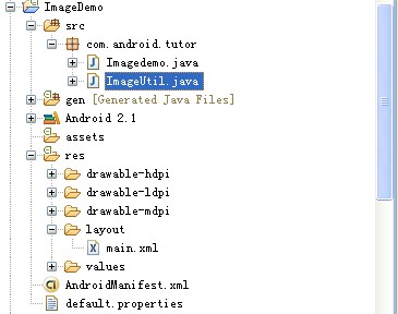 第一步:新建一個Android工程命名為ImageDemo,工程結構如下: