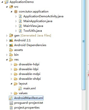 第一步:新建一個Android工程ApplicationDemo,目錄結構如下: