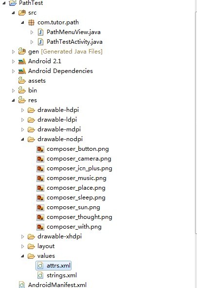 下面我們修改main.xml的tutor屬性為left_bottom,並且修改PathMenuView.java中的menuResIds.
