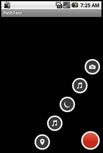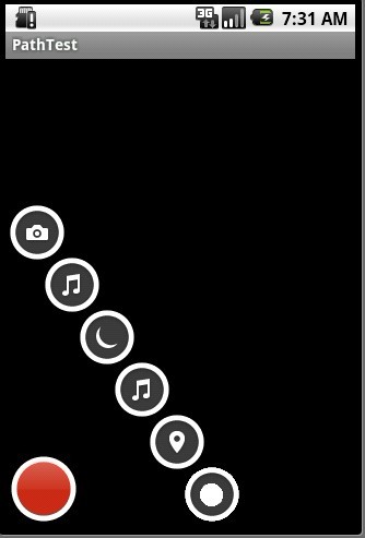 好了,今天給大家分享的是Path菜單的簡單實現,可以支持自定義方向(左上,右上,右下,左下),並且可以自定義菜單的個數,難點就是菜單的擺放位置(動態設置margin),還有動畫的實現,其實動畫只是簡單用了個TranslateAnimation,N個菜單一起移動的時候感覺很cool~