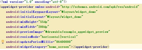 接下來根據要求編寫widget的provider文件信息(xml),minWidth和minHeight是widget的最小寬度和高度,這個值是一個參考值,系統會根據實際情況進行改變,initialLayout屬性指明widge的視圖布局文件,updatePeriodMillis屬性是widget每隔多久更新一次的時間,單位為毫秒: