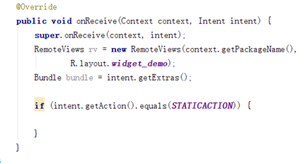 接下來在Widge類中重寫onReceive方法,這裡需要使用到RemoteView以及Bundle。當接收到對應廣播時進行數據處理(由於我們在AndroidMenifest.xml文件中注冊時將APPWIDGET_UPDAT事件和staticreceiver都指向Widge類,所以在這裡我們StaticReceiver類刪掉,將裡面對OnReceive函數重寫的部分添加在Widget類中):