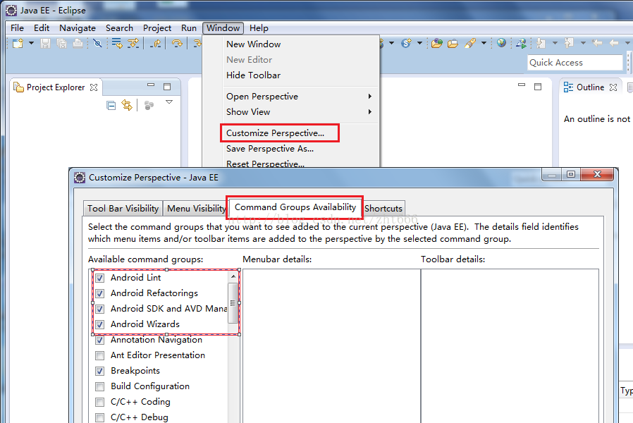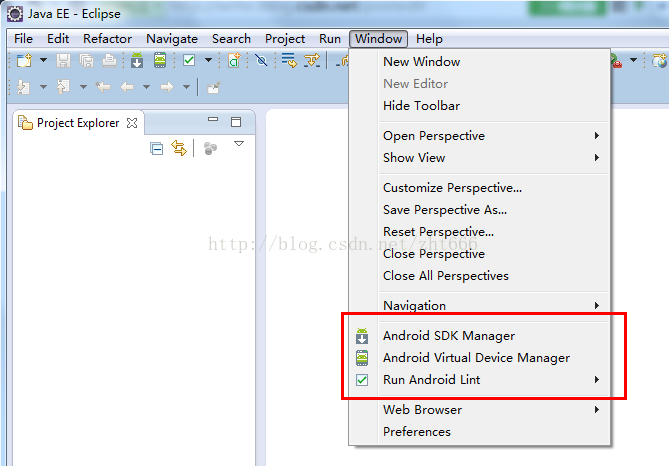 按照提示一步一步安裝完成後,會提示重啟Eclipse。重啟後如果發現Window菜單下沒有出現AVD Manager菜單,則按照下面的方法操作: