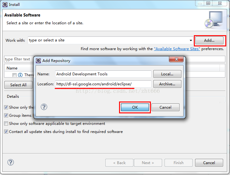 在彈出的菜單中,點擊Add,輸入名稱,然後在URL中輸入:http://dl-ssl.google.com/android/eclipse/