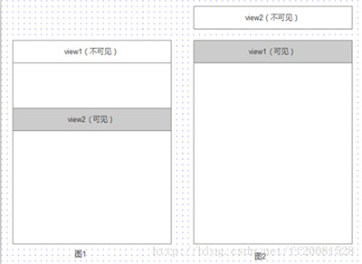 思路:其實整個頁面當中一共有兩個視覺效果一樣的View,通過滑動的位置來進行View的隱藏和顯示來達到這種效果。整個頁面的在上下滑動的過程中可以總結為兩個狀態,狀態A(如圖1所示),view2在可視區域內時,view1不可見。狀態B(如圖2所示),view2滑過了可視區域,此種狀態view1可見,view2不可見。