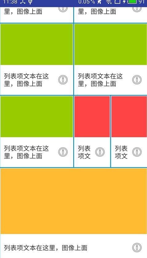 <?xml version="1.0" encoding="utf-8"?> <LinearLayout xmlns:android="http://schemas.android.com/apk/res/android" android:layout_width="match_parent" android:layout_height="wrap_content" android:background="@drawable/bg_white_box" android:orientation="vertical" android:padding="2dp" > <ImageView android:id="@+id/imageView1" android:layout_width="match_parent" android:layout_height="100dp" android:src="@android:color/holo_green_light" /> <TextView android:id="@+id/textView1" android:layout_width="match_parent" android:layout_height="56dp" android:layout_margin="8dp" android:drawableRight="@android:drawable/ic_menu_info_details" android:gravity="center_vertical" android:lines="2" android:text="列表項文本在這裡,圖像上面" android:textAppearance="?android:attr/textAppearance" /> </LinearLayout>