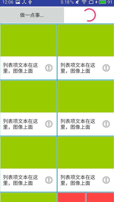 <?xml version="1.0" encoding="utf-8"?> <LinearLayout xmlns:android="http://schemas.android.com/apk/res/android" android:layout_width="match_parent" android:layout_height="wrap_content" android:background="@drawable/bg_white_box" android:orientation="vertical" android:padding="2dp" > <ImageView android:id="@+id/imageView1" android:layout_width="match_parent" android:layout_height="100dp" android:src="@android:color/holo_red_light" /> <TextView android:id="@+id/textView1" android:layout_width="match_parent" android:layout_height="56dp" android:layout_margin="8dp" android:drawableRight="@android:drawable/ic_menu_info_details" android:gravity="center_vertical" android:lines="2" android:text="列表項文本在這裡,圖像上面" android:textAppearance="?android:attr/textAppearance" /> </LinearLayout>