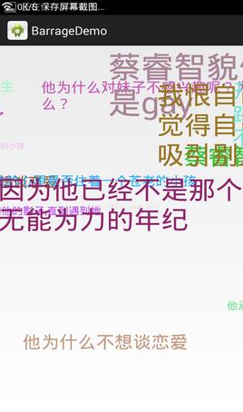 思路就是將從右往左的動畫效果,字體內容,字體大小,彈幕平移速度等屬性一起與TextView封裝成BarrageItem,並將控制效果與BarrageItem綁定在BarrageView進行顯示。思路還是比較簡單的。這裡沒有考慮到帶有表情的彈幕,我會持續更新的。