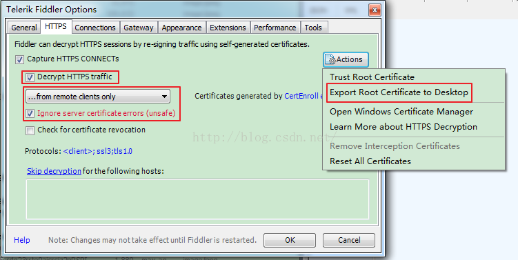 打開Fiddler的Options菜單,進入"HTTPS"的TAB頁面,依次配置如下選項: