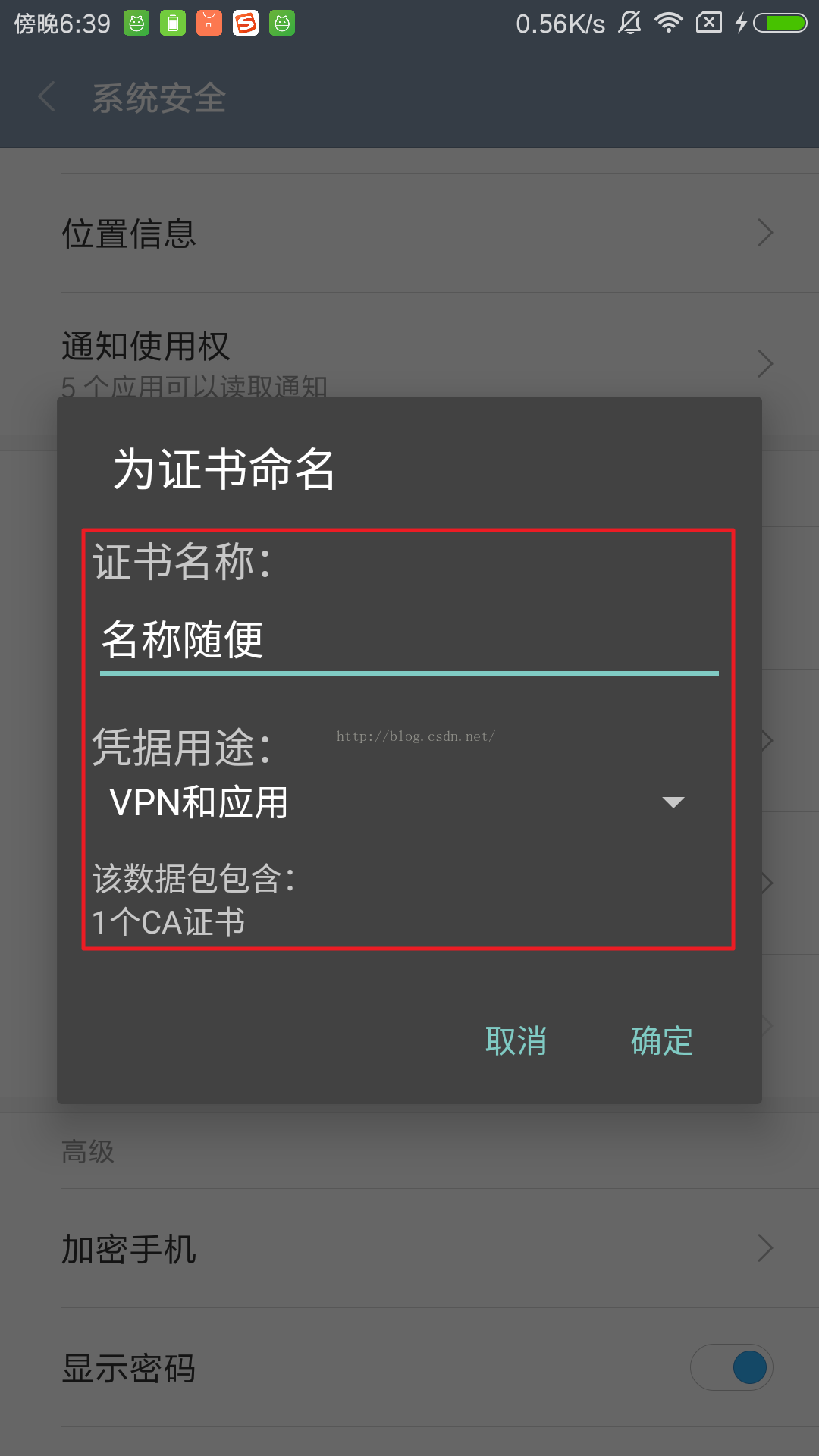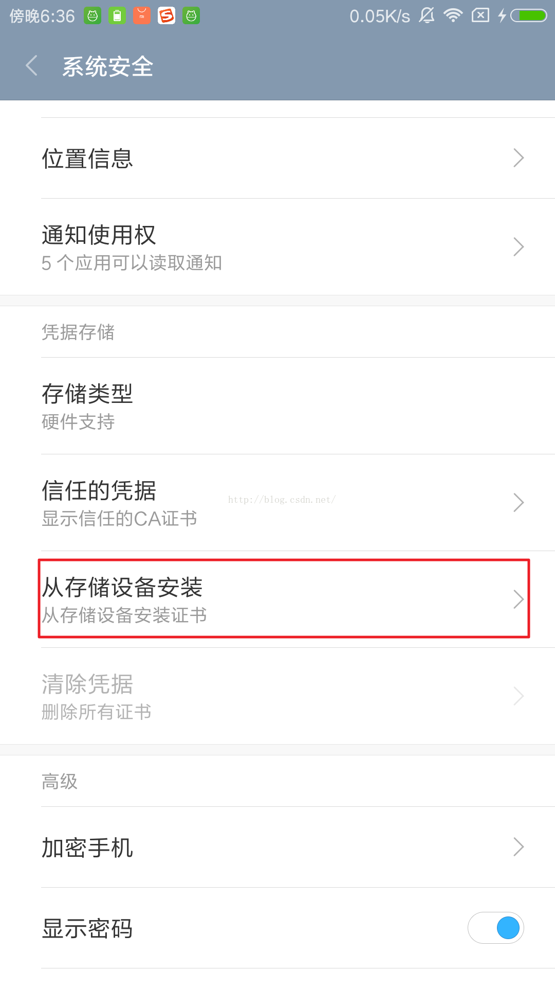 手機端需要安裝剛才Fiddler導出的證書,首先把證書放入手機的內置或外置存儲卡上,然後通過手機的"從存儲設備安裝"菜單安裝證書。如圖所示: