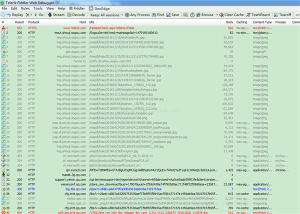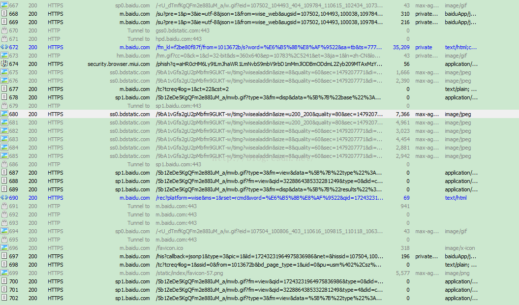 經過上面的操作,就可以在Fiddler看到手機的HTTP和HTTPS的包了,如下圖所示: