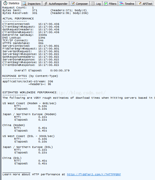 點擊某一個包,可以在右側的"Statistics"選項卡看到該包的一些狀態,包括發送時間、服務器響應時間、DNS解析時間等,如圖所示: