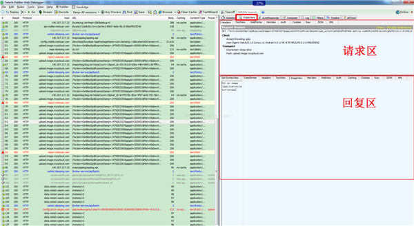 點擊某一個包,可以在右側的"Inspectors"選項卡中查看該包的詳細內容,該TAB分為上下兩部分,上部分為發送的請求詳情,下部分為服務器給出的回應詳情,並且Fiddler會自動將請求/回應解析為響應的格式(Text\Image\JSON\XML等),如圖所示: