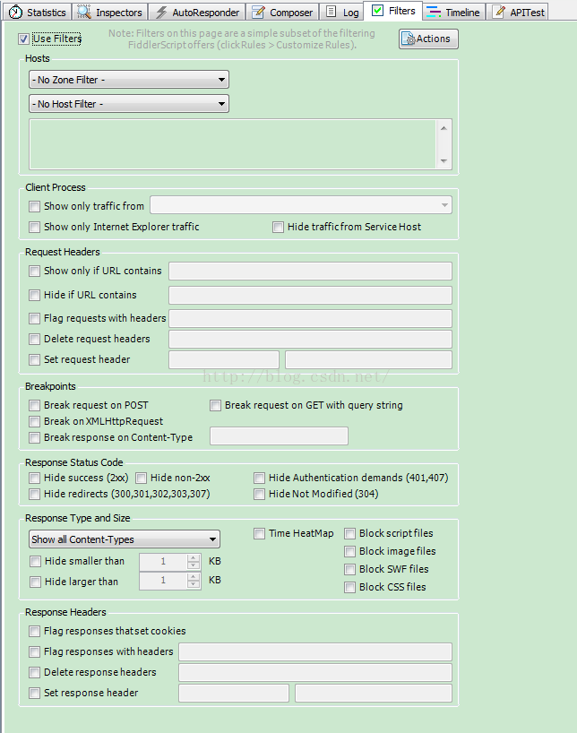 Fiddler可以設置豐富的過濾器來過濾要抓取的包,可以在"Filters"的TAB中進行配置,如圖所示: