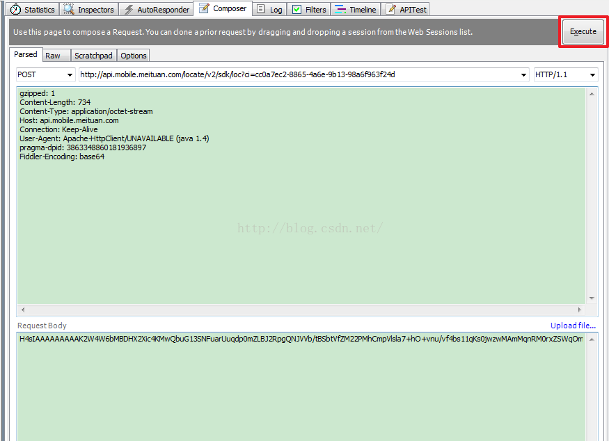 Fiddler可以通過"Composer"功能模擬發送請求,用戶可以自己手動輸入,也可以將抓到的包直接拖到該TAB中進行復制,然後點擊"Execute"按鈕發送請求,如圖所示: