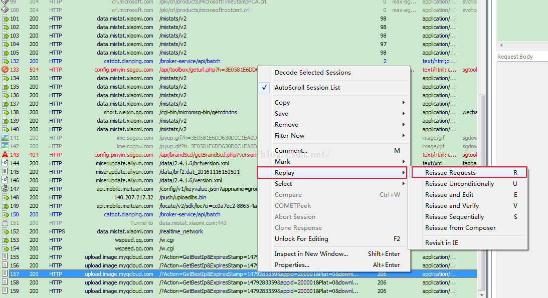 值得一提的是,如果想要將某個包連續發送N次,也可以通過在包上點擊右鍵,然後按下Shift點擊"Reissue Requests"按鈕來設置重復發送的次數,如圖所示: