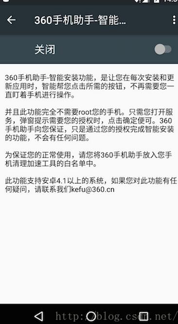 那麼對於ROOT過的手機,秒裝功能確實可以避免彈出系統安裝界面,在不影響用戶操作的情況下實現靜默安裝,但是對於絕大部分沒有ROOT的手機,這個功能是不可用的。那麼我們應該怎麼辦呢?為此360手機助手提供了一種折中方案,就是借助Android提供的無障礙服務來實現智能安裝。所謂的智能安裝其實並不是真正意義上的靜默安裝,因為它還是要彈出系統安裝界面的,只不過可以在安裝界面當中釋放用戶的操作,由智能安裝功能來模擬用戶點擊,安裝完成之後自動關閉界面。這個功能是需要用戶手動開啟的,並且只支持Android 4.1之後的手機,如下圖所示: