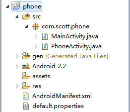 以上過程都是在一個內部完成的,現在假如我們的這個phone應用作為系統內置的應用,做為開發者,我們新建一個app,然後訪問phone應用裡的PhoneActivity。app的結構圖如下: