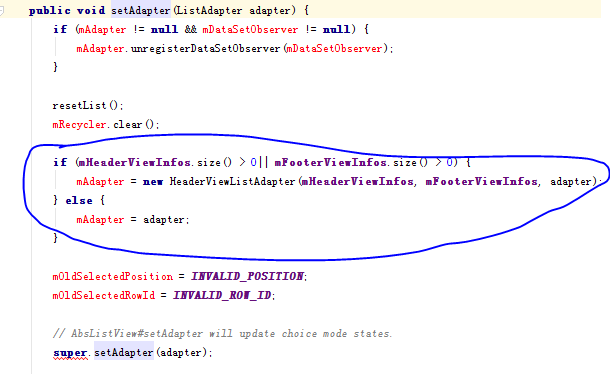 當ListView實例addheaderView()或者addFooterView後,再通過setAdapter來添加適配器,此時在ListView實例變量裡保存的適配器