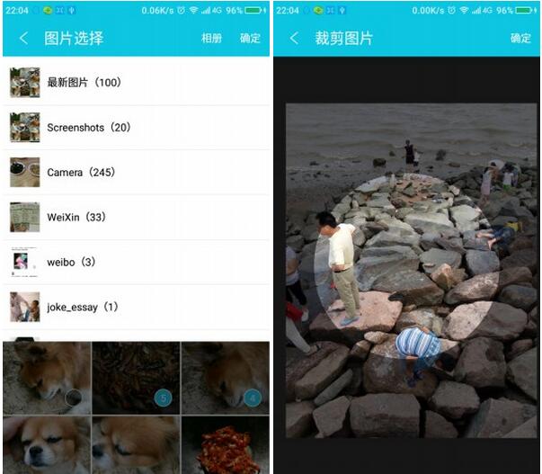在實現相冊功能之前,我們先需要明確它的邏輯。參照QQ、新浪、微博這中巨頭級的APP,當我們需要用選擇圖片時,會先打開相冊,獲取到最新的照片列表。然後點擊一個按鈕可以展開相冊列表,點擊列表內容,可以切換相冊,刷新當前照片列表中的內容。而且選擇這篇的時候,會有單選、多選、單選並裁剪等情況,多選的時候還要出現選擇效果和指示器等,單選的時候如果需要裁剪則進入裁剪頁,不裁剪則默認確定選擇,(拍照功能在後續博客中再說明)。