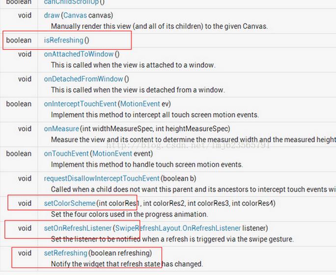 //設置刷新控件圈圈的顏色 swipe_refresh_layout.setColorSchemeResources(android.R.color.holo_blue_light, android.R.color.holo_orange_light, android.R.color.holo_red_light, android.R.color.holo_green_light); //設置刷新控件背景色 swipe_refresh_layout.setProgressBackgroundColorSchemeColor(getResources().getColor(android.R.color.white)); //設置滑動距離 swipe_refresh_layout.setDistanceToTriggerSync(100); //設置大小模式 swipe_refresh_layout.setSize(SwipeRefreshLayout.DEFAULT); //設置下拉刷新控件狀態隱藏 swipe_refresh_layout.setRefreshing(false);