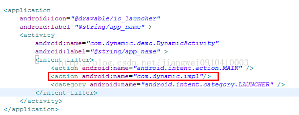 這裡的com.dynamic.impl是一個action需要在指定的apk中定義,這個名稱是動態apk和目標apk之間約定好的