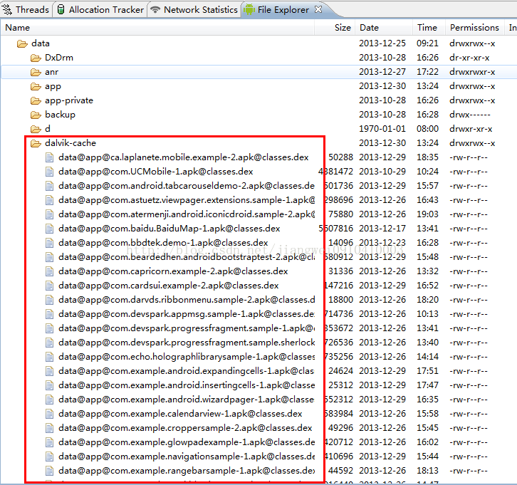 然而我們可以通過DexClassLoader方法指定解壓後的dex文件的存放目錄,但是我們一般不這麼做,因為這樣做無疑的暴露了dex文件,所以我們一般不會將.jar/.zip/.apk壓縮文件存放到用戶可以察覺到的位置,同時解壓dex的目錄也是不能讓用戶看到的。